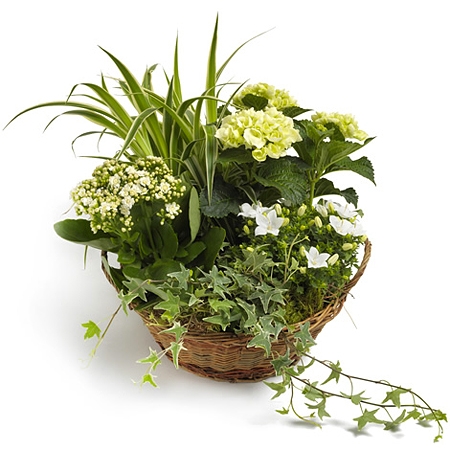 Cserepes növények varázslata, fehér színben egy kosárba rendezve.