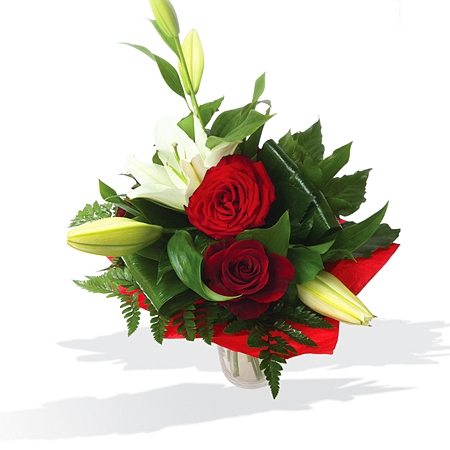 Klasszikus csokraink egyike, fehér liliom és vörös rózsa. A tökéletes párosítás.