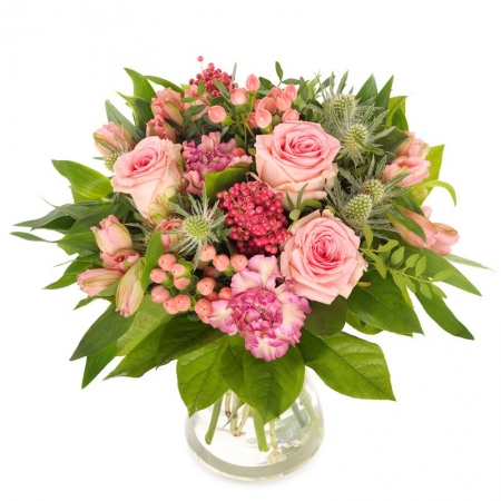 Egy kicsi édes virágos meglepetés. Pirospozsgás színvilág, stílusos és klasszikus design. Virágküldés személyesen.