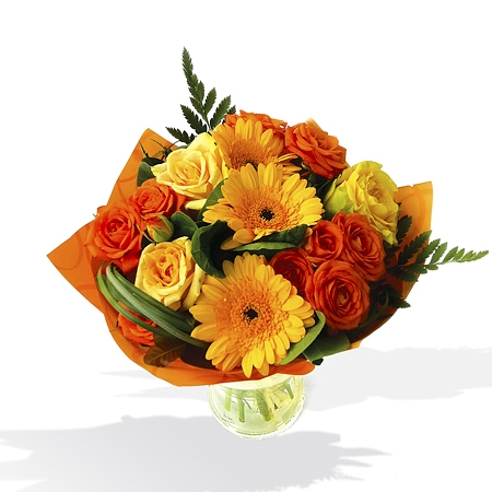 Felpezsdítő színvilág, élénk narancssárga, sárga gerberák és rózsák vegyesen. Mindenkit tűzbe hoz.